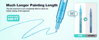 The key difference is the 6.6g ink capacity and automatic flow control. Our design holds up to 3X more ink and guarantees a consistent, even flow throughout the life of the marker, avoiding the streaking and drying issues common with traditional pump-action pens.